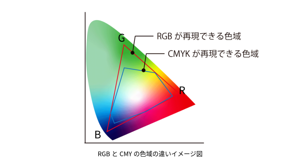 その原因は、RGBが表現できる鮮やかな色をCMYKでは作れないからです。